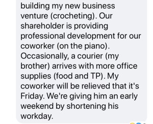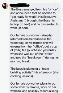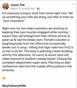 My friends and I had a bit of fun the other day sharing what our children were up to as our “co-workers.” (Huge thanks to everyone for letting me share!). I hope this brings a little bit of joy into your day! Until next time, blessings to you.